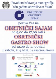 Udruženje obrtnika Sisak u suradnji s Obrtničkom komorom Sisačko-moslavačke županije i Društvom obrtnika Sisak u sklopu manifestacije promocije Monografije “180 godina organiziranog obrtništva u Sisku” priprema veliki Obrtnički gastro show i Obrtnički sajam, 21. travnja 2018. godine na Pješačkoj zoni grada Siska, od 9-17 sati. Očekuje se veliki broj posjetitelja ,članova Udruženja obrtnika iz cijele Hrvatske koji će našim obrtnicima i sugrađanima dočarati okuse i mirise autohtonih delicija svoga zavičaja. Svaki obrtnik Udruženja obrtnika Sisak ima priliku prezentirati svoje proizvode i usluge na Obrtničkom sajmu, pa ukoliko ste zaineteresirani za izlaganje, javite se u tajništvo Udruženja obrtnika Sisak, i mi ćemo rado za Vas organizirati mjesto na kojem ćete moći predstaviti svojih ruku djelo. Također pozivamo sve sugrađane, da svojim pisustvom uveličaju ovu manifestaciju, vrlo bitnu, kako za obrtnike tako i za stanovništvo grada Siska . Veselimo se Vašem dolasku.